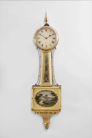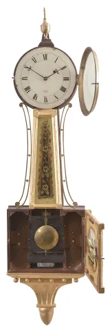 Mahogany and gilt banjo case in an old finish. There is a repair on the latch side of the head. The gilding on the throat and door frame is in nice condition. One of the balls on the bottom bracket is replaced as it is smaller than the rest. Original painted dial is attached to the case with three L-turns. The dial is signed: "Babcock, Watchmaker, Prov. R.I. ". George Wanton Babcock (1814-1883) was an engraver, jeweler and watchmaker working at Providence by the 1850s and until his death. He probably retailed this clock, but did not make it. Original hands. Tablets have some age, but look to be replaced. The bottom tablet is also cracked.