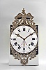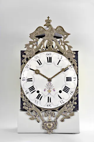 France, Comtoise wall clock, 8 day, time and strike, weight driven movement with verge escapement, thread suspension with front-hanging pendulum in an iron post and plate case with white enamel convex Roman numeral arcaded dial with Arabic minutes, polychrome floral decoration above the 6 o'clock position, two brass sunburst hands, cast brass fronton, the lower portion with a central tree flanked by cornucopias, the top with a profile of Napoleon below the crowned eagle symbol of the Empire. White enamel dial is in excellent condition. The brass hands and fronton are also very good. There is a modern machine screw holding one half of the lower fronton. Modern washer between the hands. There is surface rust on the steel parts within the movement. Wide feet on upright movement pillars. Brass fly. The tree on the fronton represents liberty, while the cornucopia signify the abundance of nature. The profile of Napoleon and the presence of the Imperial Eagle in the fronton casting places this clock from 1804 to 1814. This clock was sold by Ivoire Saint-Etienne on October 13th, 2012 as lot number 38.