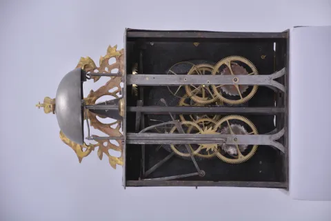 White enamel dial is in excellent condition. The brass hands and fronton are also very good. There is a modern machine screw holding one half of the lower fronton. Modern washer between the hands. There is surface rust on the steel parts within the movement. Wide feet on upright movement pillars. Brass fly. The tree on the fronton represents liberty, while the cornucopia signify the abundance of nature. The profile of Napoleon and the presence of the Imperial Eagle in the fronton casting places this clock from 1804 to 1814. This clock was sold by Ivoire Saint-Etienne on October 13th, 2012 as lot number 38.