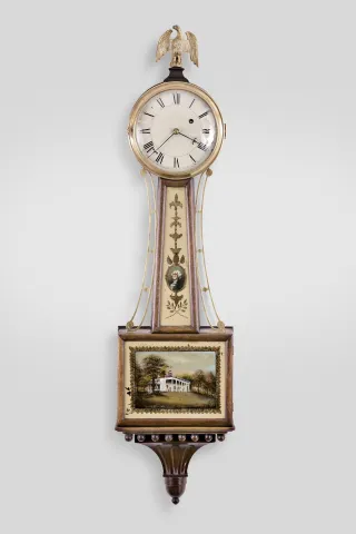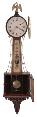Eastman Clock Co., Boston, Mass., 8 day, weight brass movement patent or banjo wall timepiece. Partially refinished mahogany case in nice condition. Original bottom tablet has some small scattered loss in the border area. Original throat tablet has a couple small loss spots. Original painted dial has minor loss at the mounting screws. Original hands. Metal throat baffle is missing. Movement is signed. The bottom bracket has separated from the sides and will need some attention.