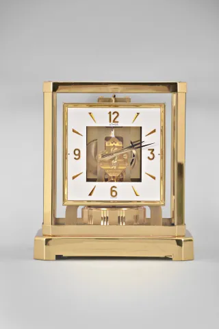 Jaeger-LeCoultre, Switzerland, "Atmos" clock, 15 jewel movement, gilt torsion pendulum, square white painted dial with applied gilt Arabic numerals and arrow markers, gilt hands all contained in a glazed rectangular case with removable front panel, serial