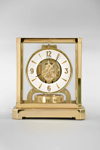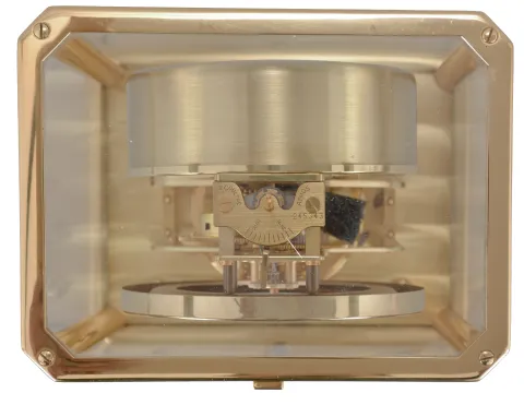 Jaeger- LeCoultre, Switzerland, "Atmos" clock, 15 jewel movement, gilt torsion pendulum, round white painted dial with applied gilt Arabic numerals and arrow markers, gilt hands all contained in a glazed rectangular case with removable front panel, serial