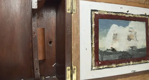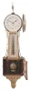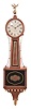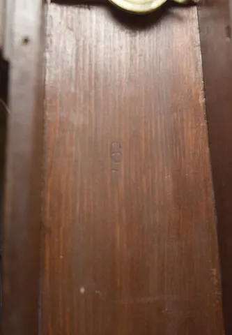 (1) The case construction, particularly the head, is a bit awkward and not what we might expect of Howard. Evidence of glue and clamps indicate that it has had repairs by a non-professional. There is a "6" stamped into the wood of the backboard,a throat, box, and door frame. The signature on the dial seems to sit well above the rest of the paint and even some of the scratches, letting us know that it was applied when the dial already had some age. The dial otherwise seems good, though it has been touched up around the mounting screws. The signed movement comes from a Howard banjo no. 5 as indicated by the stamps. Two small wood piece below the movement do not look proper. Reverse painted glasses have some small losses and in-painted areas. Unfinished weight baffle behind the throat with "1908" written in pencil and black-painted baffle behind the pendulum. Damascened pendulum appears to be an authentic Howard. Finial is not correct shape, but is nicely turned from solid brass. (2) Good Foster Campos signed dial, but that is probably the only thing about the clock associated with him. The clock is in good condition with a thin finish. Modern, unsigned banjo movement. Evidence of glue and Phillips head screws inside the case. No weight. Dimensions are for the Howard (1). Sold "as is "