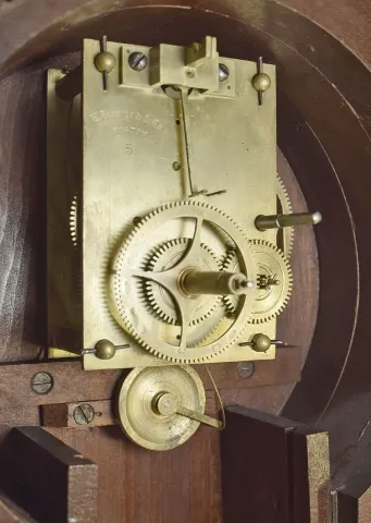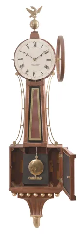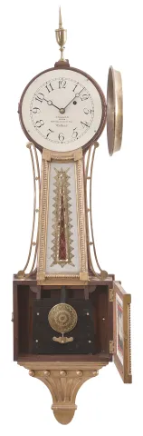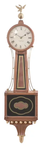 Clocks- 2 (Two): Banjo: (1) Unknown, possibly E. Howard, Boston, banjo clock, 8 day, time only, weight driven movement in a mahogany gilt front case with painted metal dial reading "E. Howard & Co. / Boston / Reproduction of The Willard.", c1910. (2)