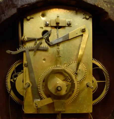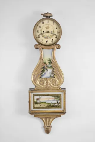 Unknown, possibly Massachusetts, 8 day, time and strike weight brass movement gilt front box Lyre clock. It is difficult to date this clock. Mahogany and carved gilt case appears to be mid 19th century. It has some loss to the gilding and darkening of the finish over the gilding. Carved lyre front has a couple of surface cracks. Metal baffle is replaced. Both tablets have age, but not original. Case brass bezel and dial are oversized. Dial, hands and tablets are c1920 and may have been added to an older case or the entire clock may be c1920.