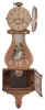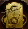 It is difficult to date this clock. Mahogany and carved gilt case appears to be mid 19th century. It has some loss to the gilding and darkening of the finish over the gilding. Carved lyre front has a couple of surface cracks. Metal baffle is replaced. Both tablets have age, but not original. Case brass bezel and dial are oversized. Dial, hands and tablets are c1920 and may have been added to an older case or the entire clock may be c1920.