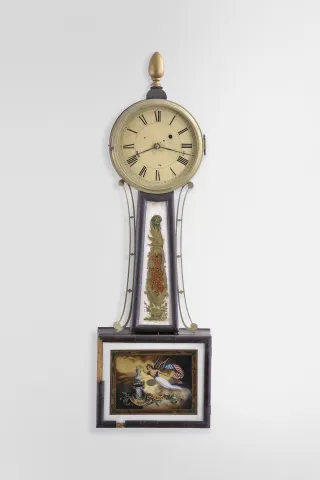 Massachusetts, 8 day, weight brass movement patent or banjo wall timepiece. Mahogany case in original finish has a small piece of the molding missing on the bottom door. The larger molding piece is inside the case. There are also shrinkage cracks in the door molding as well. Original painted dial has age darkened with some staining in the center, minor paint loss and now has a clear coating. The dial is attached to the case with three L-turns. Original hands. Original throat tablet. Bottom tablet and finial are replaced. Movement is attached to the case with a screw through the backboard.