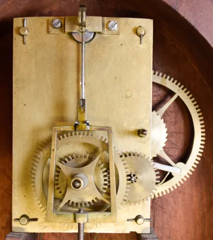 Mahogany case in original finish has a small piece of the molding missing on the bottom door. The larger molding piece is inside the case. There are also shrinkage cracks in the door molding as well. Original painted dial has age darkened with some staining in the center, minor paint loss and now has a clear coating. The dial is attached to the case with three L-turns. Original hands. Original throat tablet. Bottom tablet and finial are replaced. Movement is attached to the case with a screw through the backboard.