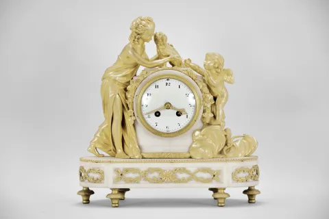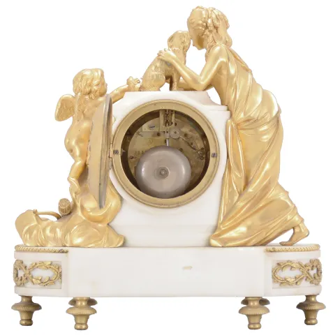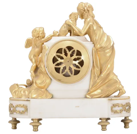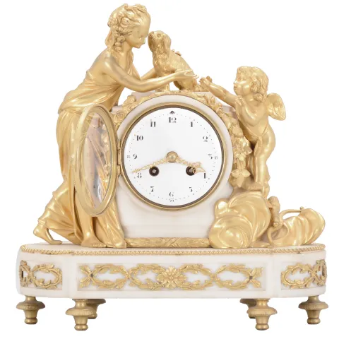 Samuel Marti, Paris, France, figural mantel clock, 8 day, time and strike, spring driven pendule de Paris movement in a white marble case on turned brass feet with applied gilt ornaments, supporting gilt figures of a woman, dog, and Cupid, white convex