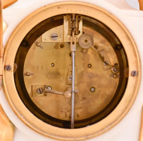 The white marble case is in very good condition with some tiny chips and one small chip on the lower right side. The white enamel dial is very good. Gilt hands are excellent. Gilt figures are also very good. Marti movement is stamped with the award medal for 1900. Case and dial are both marked "France" and the movement "Made in France ".