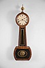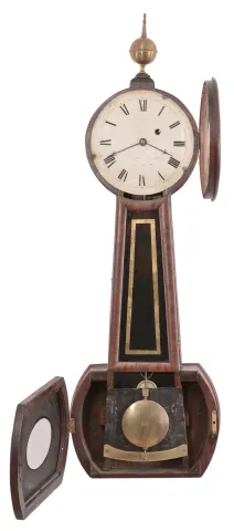 Massachusetts banjo wall clock, 8 day, time only, weight driven movement with T-bridge suspension in a mahogany and rosewood veneer case with hinged reverse painted throat and lower tablets and painted metal dial the case retains on older finish and there is a crack and repair in the bezel.Tthe outside of the backboard has a later thick layer of stain on it. The finial is a replacement. The tablets have been reblacked. The Simon Willard signature on dial is spurious.