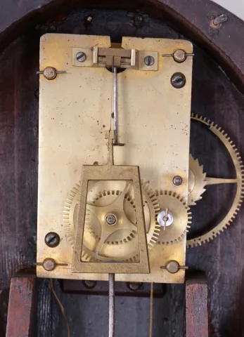 the case retains on older finish and there is a crack and repair in the bezel.Tthe outside of the backboard has a later thick layer of stain on it. The finial is a replacement. The tablets have been reblacked. The Simon Willard signature on dial is spurious.
