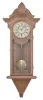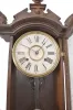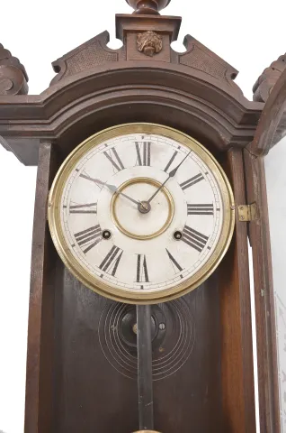 Clocks- 2 (Two): (1) E. N. Welch, Forestville, Conn., wall clock, 8 day, time only, spring driven movement in an ash case with walnut burl accent and painted metal dial, c1890; (2) E. N. Welch, Forestville, Conn., wall clock, 8 day, time and strike, spring driven movement in a walnut case with carved elements, c1880. (1) Case has very little finish suggesting that it may have been rubbed down some time ago. Some oxidation on the brass portions of dial and pendulum bob. Hands and glass appear to be original. Bottom finial has been reglued. Pendulum rod may be a replacement. The movement is signed. A similar cased was used for Kroeber's Regulator No. 31. (2) The case with original finish which has been selectively cleaned. Dial with some stains. Lower finials on either side are replacements. Center finial may be a shortened original. Movement is signed. Dimensions are for the time and strike (2) .