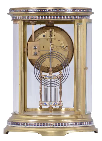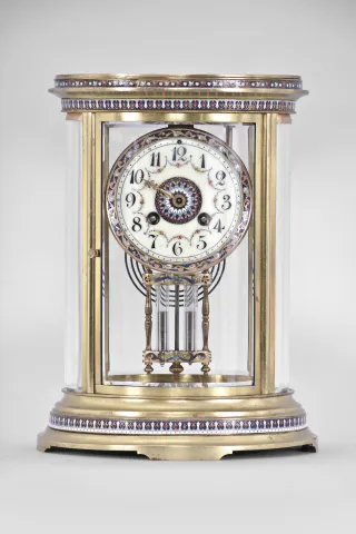 S. Marti & Cie, Paris, France, oval crystal regulator, 8 day, time and strike, spring driven pendule de Paris movement in a gilt brass case with four curved beveled glasses, cloisonne trim in bands around the case top and bottom, dial, and on the frame of the compensating pendulum, cream colored enamel dial with Arabic numerals, gilt hands, and double-vial pendulum. The case is dusty and dirty and could stand polishing, but otherwise this is a clean clock. All four curved beveled glasses are good. Well made movement with Brocot escapement between the plates has the Marti 1889 award stamp. It is also stamped "Made in France" The dial is perfect but for some very small losses along the bottom edge that have been masked with a bit of white filler. Rack and snail strike sounds on a cathedral gong. Just a bit of attention will make this a very nice clock.