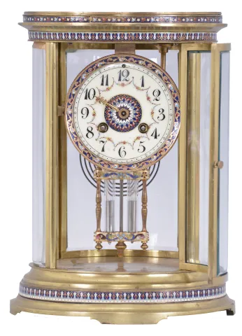S. Marti & Cie, Paris, France, oval crystal regulator, 8 day, time and strike, spring driven pendule de Paris movement in a gilt brass case with four curved beveled glasses, cloisonne trim in bands around the case top and bottom, dial, and on the frame of
