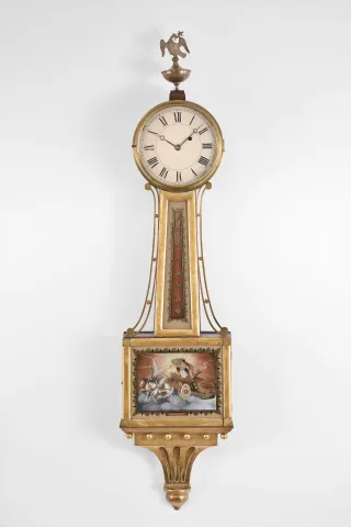 Unknown, Massachusetts, 8 day, weight brass movement patent or banjo wall timepiece. Gilt and mahogany case in nice condition in an old finish. The gilding looks to now have a clear top coating. Both tablets are old, but probably replacements. Period painted dial is attached to the head with two screws and has some lifting and scattered loss. The figured mahogany veneer throat sides have some age cracking. Side tabs cast as part of the backplate are used to mount the movement in the case. Original hands.