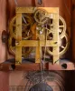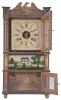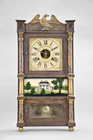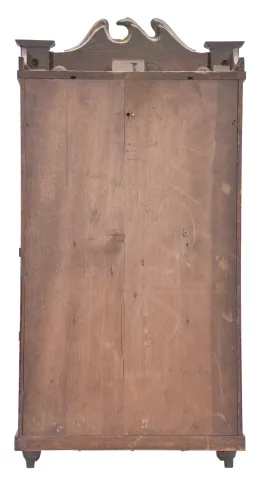 Mahogany and mahogany veneered case in original crusty finish in nice condition. The columns have original finish under the old finish. Original painted dial has some wear, but is in otherwise nice condition. Center tablet and hands are original. Little remains of the bottom tablet. Clean label inside. Movement is signed.