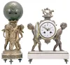 Clocks- 2 (Two) French mantel: (1) Samuel Marti, Paris, for A. Thelot, figural mantel clock, 8 day, time and strike, spring driven pendule de Paris movement, white marble case on brass feet with two cast child figures supporting a white marble case between them, white enamel dial with polychrome garlands and Arabic numerals, gilt hands, c1900; (2) France, figural mantel clock, 8 day, time and strike, spring driven pendule de Paris movement, green onyx base on cast brass feet, supporting three putti holding a green patinated sphere and the mechanism within aloft, applied Roman numerals and gilt snake-form hands, c1915. (1) White marble case is very good with only the smallest of chips to the edges. Dial, hands, and glass all very good. The gilding has worn off of the two figures. The movement is signed. (2) Onyx base is very good. Some of the green patination has worn off of the sphere that holds the unsigned movement. The three figures have been touched up with gold paint. Nice hands in the form of a snake. Dimensions are for the clock with white marble base (1). Sold "as is ".