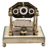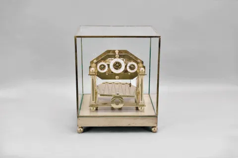 Emperor Clock Co. Ltd., London, a reproduction Congreve rolling ball timepiece, fusee movement with separate dials for minutes, hours and seconds, the plates supported by four turned columns, all resting on ball feet, the tray with zig zag path for the steel ball "oscillator" suspended below the movement, with rectangular base, and conforming glass dome, serial #053 from an edition of 250. brass components with peeling lacquer, scratches, staining, and spotting, some steel with minor oxide, running, dome dirty