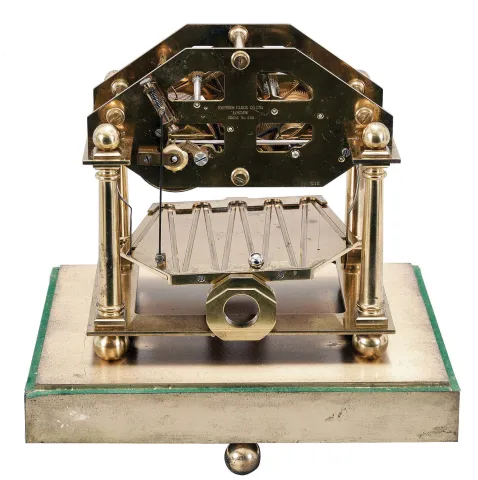 Emperor Clock Co. Ltd., London, a reproduction Congreve rolling ball timepiece, fusee movement with separate dials for minutes, hours and seconds, the plates supported by four turned columns, all resting on ball feet, the tray with zig zag path for the