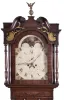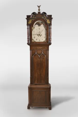 Charles Monks, Prescot, Lancashire, England, tall clock, 8 day, time and strike, weight driven movement in a Gothic revival mahogany case with reverse painted glass inserts above hood door, Gothic shaped trunk door over a base with framed panel on straight bracket feet. The painted metal dial has moon phase, seconds bit and calendar. the case retains its original finish. The glass panels are intact and without damage. The thin right return molding below case is detached but present. There are minor age cracks below hood. The dial is faded with some flaking to moon phase and the signature is only perceptible under black light. Hands appear original. Brass eagle finial an old replacement. This style of clock had fancy wood finials.