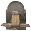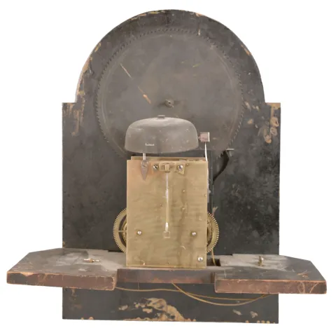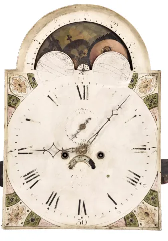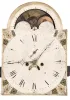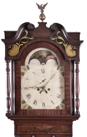 the case retains its original finish. The glass panels are intact and without damage. The thin right return molding below case is detached but present. There are minor age cracks below hood. The dial is faded with some flaking to moon phase and the signature is only perceptible under black light. Hands appear original. Brass eagle finial an old replacement. This style of clock had fancy wood finials.