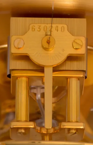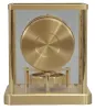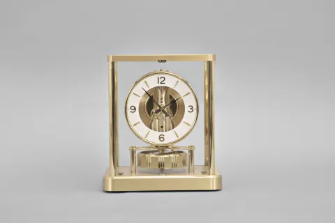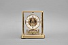 Jaeger-LeCoutre, Switzerland, "Atmos" clock, 13 Jewel, caliber 540 movement, gilt torsion pendulum, round white painted dial with applied gilt numbers and hour markers, gilt hands, all contained within a glazed rectangular case with flip-front door, movement serial number 630240. The gold finish on the case, glass panels, round dial and movement all look very good. The pendulum rotates and the hands advance.