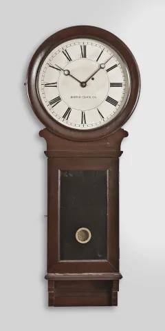 Boston Clock Co., Boston, Mass., wall regulator, 8 day, time only, weight driven movement a in mahogany case with painted metal dial. case is in very good condition and has had an application of clear finish applied over the original. Wood weight baffle has split horizontally and been repaired. Bezel glass is wavy. Lower tablet has been repainted with care. The metal dial has very fine craquelure. A large section of the center of the dial has been touched up with white paint. The color match is quite good, but the new paint has a bit less gloss compared to the original. Bluing is somewhat worn off of hands. Very nice pendulum with damascened pattern. Signed movement with spoked hour wheel is stamped with serial number is 438. A very hard-to-find model.