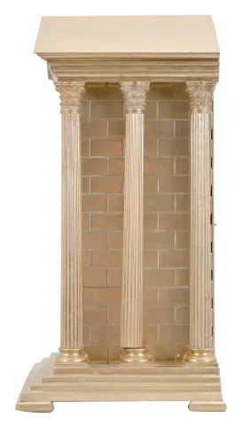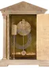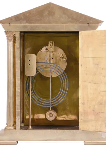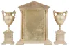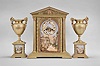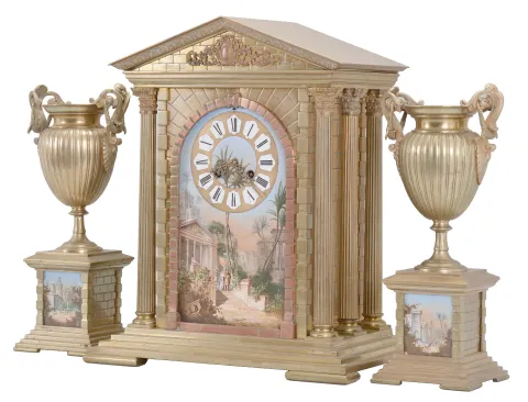 France, three piece mantel garniture set, 8 day, time and strike, spring driven pendule de Paris movement in a metal case of classic architectural form with stepped base, six full Corinthian columns flanking an ashlar facade with central arch, a painted ceramic panel within displaying a gilt chapter ring with Roman numerals, a scene of royals walking amidst an ancient city below the dial, all topped by a pediment with applied gilt ornament, two matching urns, both with painted ceramic panels. The gilding has worn off of much of the arch and the roof of the building will need to be secured, but otherwise this is an attractive and impressive case. The left end of the applied ornament in the pediment is absent. Beautiful, unsigned, painted ceramic panels on all three pieces. Substantial urns with matching architectural details. There is a tiny chip to the ceramic panel below one of the urns. Knob for back door is missing. The movement is signed with the initials "E. A." on either side of an anchor. Strikes on large cathedral gong.