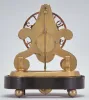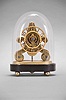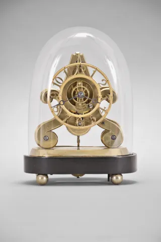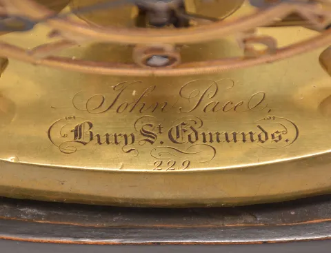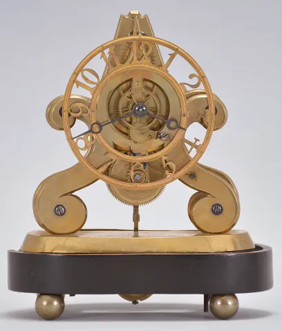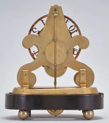 John Pace, Bury, St. Edmunds, a rare miniature skeleton timepiece, the brass scroll frames and brass base with beveled edges, the back plate measuring just 5 1/4" in height, 8 day fusee movement with thread suspension and recoil escapement and light wheels with five spoke crossings, skeletonized, Arabic numeral dial with knurled inner and outer rings, blued steel Breguet style hands, all resting on an ebonized oval base with brass ball feet and conforming dome. Brass base signed "John Pace Bury St. Edmunds 229 " brass base, feet and frames with minor tarnish, hole in back plate for pallet arbor enlarged, and with burrs, dial good, hands reblued, hour hand with minor oxide, wheel side of barrel with scratches, dents and solder, barrel also with replaced teeth, crutch replaced, pendulum replaced, and with repairs, ebonized base with loss at left, dome good.
