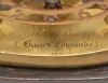 brass base, feet and frames with minor tarnish, hole in back plate for pallet arbor enlarged, and with burrs, dial good, hands reblued, hour hand with minor oxide, wheel side of barrel with scratches, dents and solder, barrel also with replaced teeth, crutch replaced, pendulum replaced, and with repairs, ebonized base with loss at left, dome good.