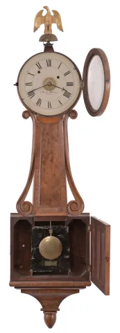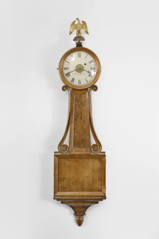 Unknown, possibly Boston area, 8 day, weight-driven brass movement patent or banjo wall timepiece with alarm.