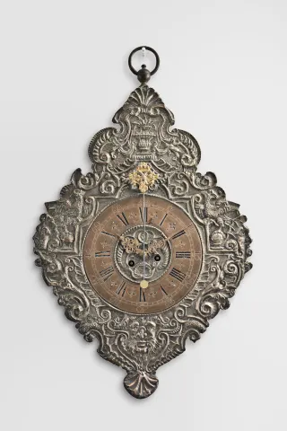 Southern Germany or Austria, telleruhr clock, 8 day, time and strike, spring driven movement with verge escapement and cowtail pendulum, mounted to an iron plate covered in copper relief birds, palmettes, and human faces on a scrolling field, the pendulum arbor cover in the form of a double-headed eagle, copper chapter ring with Roman numerals for the hours and Arabic numerals at five minute intervals, pierced brass hands with copper finish. Brass hands have been repaired. The palmette at the bottom of the clock has been repaired and now has a different patina because of it. Evidence of modern adhesive holding the copper to the iron backing. Rear cover is made from brass and may be later. Rack and snail strike on a large bell mounted behind the movement. Rack tail made of brass may be an old repair. Unsigned round movement with thick plates, nicely turned pillars, and whimsical rack component in the form of a boot. Lots of evidence of hand finishing. Lever for hour repeat on the left side behind the dial.