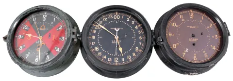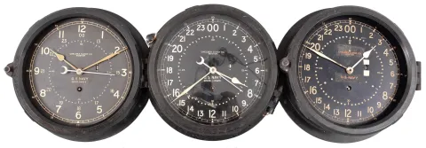 Clocks- 6 (Six) Chelsea Engine Room Clocks: Chelsea Clock Co., Boston, Mass., for the U.S. Navy, "Deck & Engine Room" clocks, 8 day, time only, spring-driven balance wheel movements with center seconds in black phenolic cases with hinged bezels, 8.5 inch