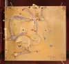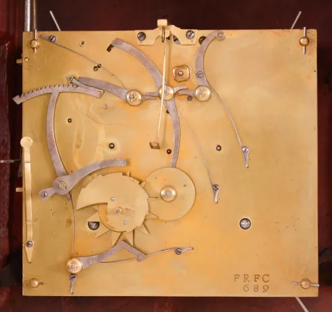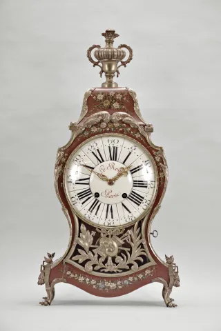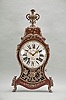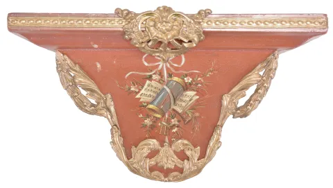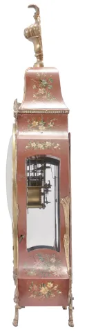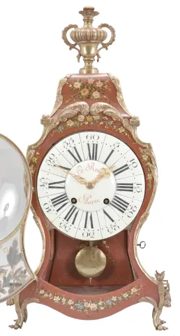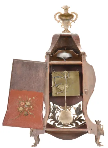 Switzerland, a late 18th century Neuchateloise bracket clock, the red, hardwood case and bracket with painted floral ornament, the bracket with polychrome musical trophy, and with foliate, repousse mounts, and top with cast bronze urn finial, faux thirteen piece enamel dial, eight day movement with rectangular plates, rear mounted strike work, crown wheel escapement, silk thread suspension, and Dutch striking on two bells, the back plate marked "FRFC 689 " case with minor repairs, repainted, surface with crazing, rear right foot repaired, dial replaced, hands good, movement ticks and strikes, but the striking is set up incorrectly and so the full hour is not reported, pendulum replaced