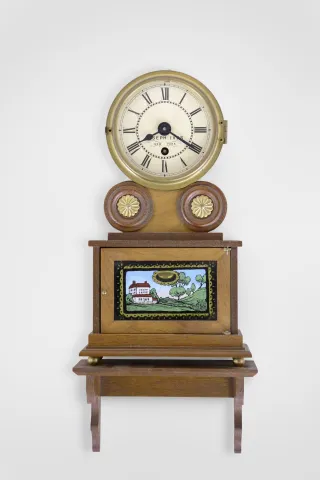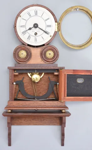 Michael Paul, Berea, Ohio, 30 hour, wagon spring brass movement miniature timepiece copy of a Joseph Ives Brooklyn model shelf clock with a shelf. This example is number 3 of 43.
