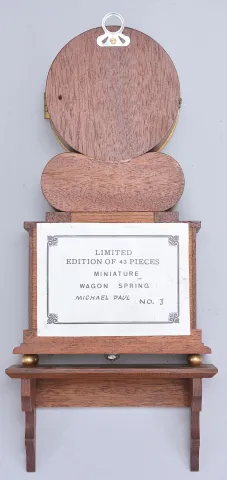 Michael Paul, Berea, Ohio, 30 hour, wagon spring brass movement miniature timepiece copy of a Joseph Ives Brooklyn model shelf clock with a shelf. This example is number 3 of 43. Miniature version in mahogany in overall excellent condition.