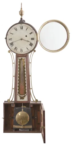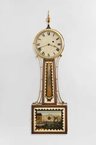 Unsigned, Massachusetts, 8 day, weight brass movement patent or banjo wall timepiece. Mahogany case In an old and possibly original finish. The bottom box is of dove tailed construction. The movement is attached to the case with through bolts. Original hands,. The throat frame is attached to the case with two screws. Movement is stamped: "1.0" and the case is stamped "76 ". Both tablets are replaced, but done on old glass. The dial numerals have been strengthened. Dial is attached to the case with three L-turns. Finial is modern.