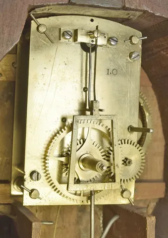 Mahogany case In an old and possibly original finish. The bottom box is of dove tailed construction. The movement is attached to the case with through bolts. Original hands,. The throat frame is attached to the case with two screws. Movement is stamped: "1.0" and the case is stamped "76 ". Both tablets are replaced, but done on old glass. The dial numerals have been strengthened. Dial is attached to the case with three L-turns. Finial is modern.