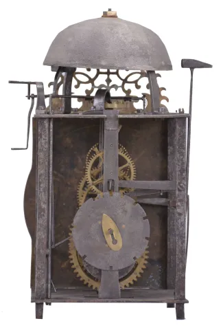 France, lantern clock, 30 hour, time and strike, weight driven movement, verge escapement with upward facing crown wheel, thread suspension with side-mounted pendulum, posted iron frame resting on short iron feet, brass front with integrated dial showing Roman numerals, single iron hand, topped by bell and pierced brass fronton. Dial is lightly tarnished. Heavy iron hand. The movement is fairly clean. Light oxidation on iron frame. Movement has the time train in the front and strike train in the rear. The pendulum is suspended from the right side. The movement employs a rope drive. Count wheel strike for the hours and passing strike for the half hours. Lot includes a single iron weight. No pendulum. No evidence of, or provision for, sides or back. This clock was sold by Ivoire Saint-Etienne on October 13th, 2012 as lot number 30.