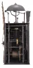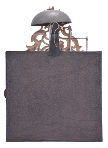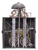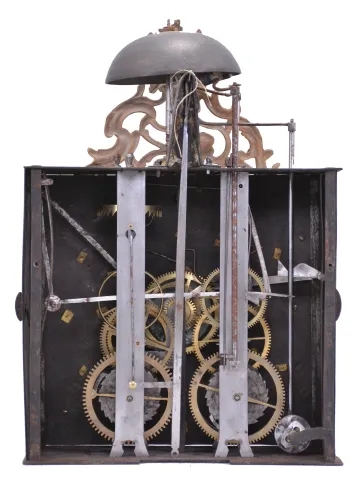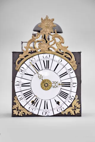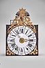 France, Louis XV Comtoise clock, 8 day, time and strike with alarm, weight driven movement with verge escapement, thread suspension with rear-hanging pendulum, iron post and plate frame, dial composed of 13 enamel panels with Roman and Arabic numerals,