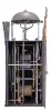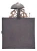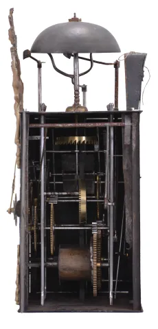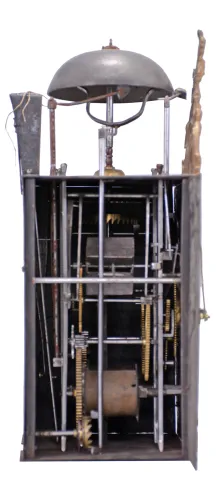 Three of the numeral cartouches have hairline cracks. There are small chips in the enamel around the winding arbor holes. Side doors open from back to front. It is also worth noting that the strike train is located on the left and time train is on the right. The suspension shroud is 3.25 inches tall. Turned iron supports for alarm crown wheel, bell, and escape wheel arbor support. Four bladed iron fan. Teardrop shaped screw heads hold the movement together. The clock uses three hammers: one to count the hours, a second to strike once on the half hour, and a third for the alarm. Unusual stirrup-shaped double sided alarm hammer. Some light rust on the iron components within the movement. The clock does not come with weights or a pendulum. This clock represents a fascinating midpoint in the evolution from the use of small enamel cartouche numerals to large once-piece enamel dials. This clock was sold by Ivoire Saint-Etienne on June 2nd, 2012, as lot number 2.