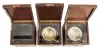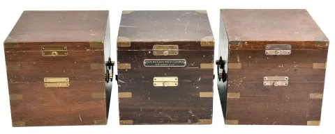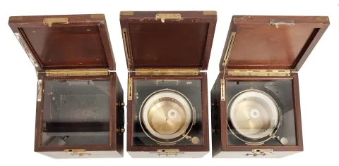 Chronometer boxes- 3 (Three): two Hamilton and one Elgin, all mahogany with brass hardware