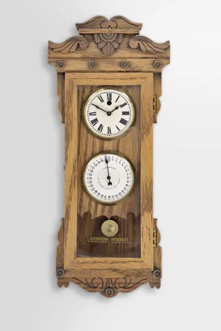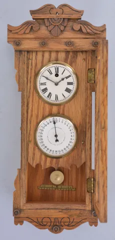 Beautifully made copy in oak of Mr. Paul's interpretation of the "Rutland" model double dial calendar clock made by the New Haven Clock Co. Case houses and miniature spring movement that also operates a simple calendar. This timepiece is in excellent condition.