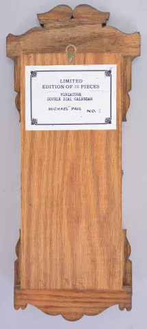 Michael Paul, Berea, Ohio, 30 hour, spring brass pendulum movement with a simple calendar miniature timepiece copy of a New Haven Clock Co. double dial calendar clock. This example is number 3 of 22. Beautifully made copy in oak of Mr. Paul's interpretation of the "Rutland" model double dial calendar clock made by the New Haven Clock Co. Case houses and miniature spring movement that also operates a simple calendar. This timepiece is in excellent condition.