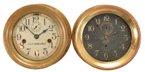 Clocks- 2 (Two) Coast Guard Marine Clocks: (1) Seth Thomas Clock Co., Thomaston, Conn., marine clock, 8 day, time only, twin spring driven balance wheel movement in a brass case with hinged bezel, 6 inch silvered dial reading "U.S. Life-Saving Service", subsidiary seconds and blued steel spade hands. (2) Waltham Clock Co., Waltham, MA, "Deck Clock No. 1", 8 day, time only, spring-driven balance wheel movement in a brass case with screw-on bezel, 6 inch black dial with white numerals, subsidiary seconds dial, and blued steel hands. (1) The U.S. Life-saving Service was a government agency dedicated to saving the lives of shipwrecked mariners. It was merged with the Revenue Cutter Service in 1915 to form the U.S. Coast Guard. The clock is somewhat greasy, but this has probably protected it over the years. The silvered dial is a a bit dirty, but in generally good condition. The movement ticks. (2) Clock is missing glass. Case has scratches and lacquer that has started to degrade. Seconds bit is missing and hands have been bent a bit out of shape. Clock ticks. The clock originally was issued to the U.S. Navy as that name is also on the dial, but was engraved over.