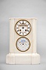 A. Brocot and Delettrez, Paris, France, for Tiffany, Young & Ellis, New York, double dial calendar clock, 8 day, time and strike with rolling moon and calendar indicating day, date, and month perpetually, spring driven movement with visible Brocot escapement in a molded white marble case with white enamel dials, beveled glasses, and blued steel hands. The white marble case has a few very tiny chips along a few edges, but no major losses. Striking is the fact that the large back door is intact. Sadly, someone engraved a Social Security Number into the top of the back door. If placed against a wall, this will not be visible. Enamel clock dial is excellent. The signature of retailer is clear and sharp.The calendar dial is also in excellent condition, showing the days and months in English and the rolling moon on a field of stars. The well made time and strike movement with open Brocot escapement on the dial, with original carnelian pallets. The movement is signed. Both movements look clean. A very nice example.