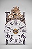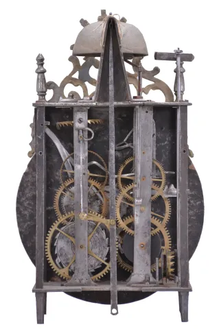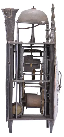 The thick earthenware dial is in good condition with a small discoloration on the number "XI" and tiny chips around the winding arbor holes. Hand-finished iron hands. Wood winding drums were carved to shape rather than turned. Very light construction on the inverted crown wheel, indicating its age. Notched iron fly with four blades. Small feet on movement uprights. Suspension shroud measures 3.75 inches tall. Contoured case back provides clearance for pendulum leader. It is notable that the time train is on the right side of the clock and the strike train on the left. Doors on both sides are absent. The clock does not come with weights or a pendulum. This clock was sold by Ivoire Saint-Etienne on October 13th, 2012 as lot number 13.
