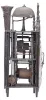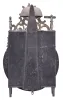 France, Comtoise lantern clock, 8 day, time and strike with alarm, weight driven movement with verge escapement, thread suspension with rear-hanging pendulum in an iron post and plate frame, early faience dial with raised portions under each Roman numeral, outer ring with Arabic numerals every five minutes, two steel hands, brass alarm ring with Arabic numerals, topped by a cast brass fronton with image of the sun / Apollo flanked by two turned iron finials, all standing on tapered iron feet. The thick earthenware dial is in good condition with a small discoloration on the number "XI" and tiny chips around the winding arbor holes. Hand-finished iron hands. Wood winding drums were carved to shape rather than turned. Very light construction on the inverted crown wheel, indicating its age. Notched iron fly with four blades. Small feet on movement uprights. Suspension shroud measures 3.75 inches tall. Contoured case back provides clearance for pendulum leader. It is notable that the time train is on the right side of the clock and the strike train on the left. Doors on both sides are absent. The clock does not come with weights or a pendulum. This clock was sold by Ivoire Saint-Etienne on October 13th, 2012 as lot number 13.