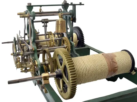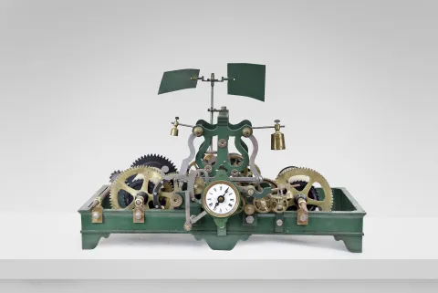 Europe, tower clock, time and strike, weight driven movement with pinwheel escapement and indicator dial in a green painted cast iron frame